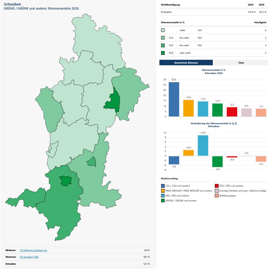 Die Ergebnisse der Kommunalwahlen in Bayerisch-Schwaben sind für uns Grüne bitter: Viele erfahrene und engagierte Kommunali verlieren ihre Mandate. Im Vergleich zur Bundestagswahl 2025 haben sich unsere Werte allerdings flächendeckend verbessert, was ein Aufwärtstrend bedeuten könnte. Wir bedanken uns bei allen Kandidierenden und Wahlkampfhelfer*innen – und gratulieren allen Gewählten!