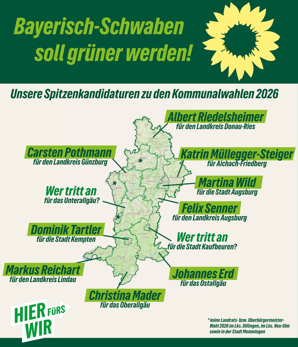 Unser Ziel als Grüne ist es, mit Spitzenkandidaturen in allen schwäbischen Landkreisen und allen Städten anzutreten und möglichst viele, möglichst starke und vielfältige grüne Listen aufzustellen.