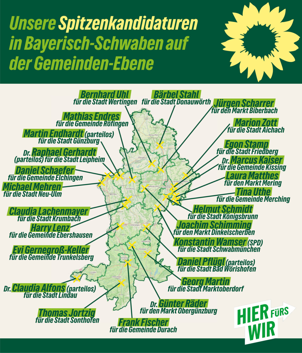 Unser Ziel als Grüne ist es, mit Spitzenkandidaturen in allen schwäbischen Landkreisen und allen Städten anzutreten und möglichst viele, möglichst starke und vielfältige grüne Listen aufzustellen.